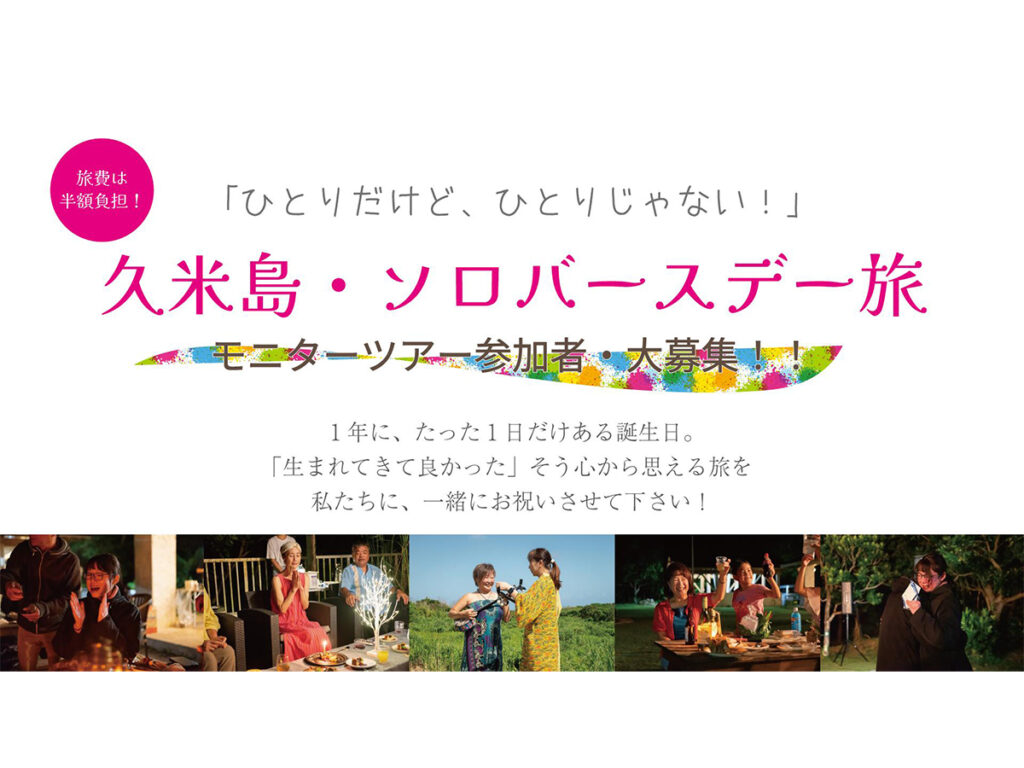 R6年度に本事業で開発した観光コンテンツ「久米島まるごとBirthday旅」でのモニター調査データをもとに、R7年度はおひとり様・ソロ活層に向けた「ソロ・バースデー旅」を開発します。 一般的なひとり旅の不安要素を払拭し、人の力を武器にした感動体験に満ちたコンテンツ開発を行う事で販売力のある商品に仕上げていきます。 R6年度制作したコンテンツの販売を継続するとともに、新たに中心市街地をメインとしたショートコンテンツを開発し、ラインナップのさらなる充実を図ります。
